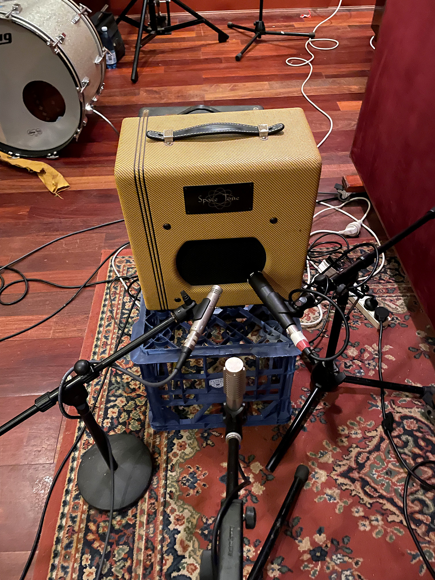 Close mics – Shure SM57, Neumann KM84, AEA N-92 ( 1 foot back – to one protect the ribbon, amps were LOUD, and to reduce proximity effect)