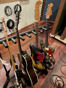 Close mics – Shure SM57, Neumann KM84, Royer R-121 ( 1 foot back – to one protect the ribbon, amps were LOUD, and to reduce proximity effect)