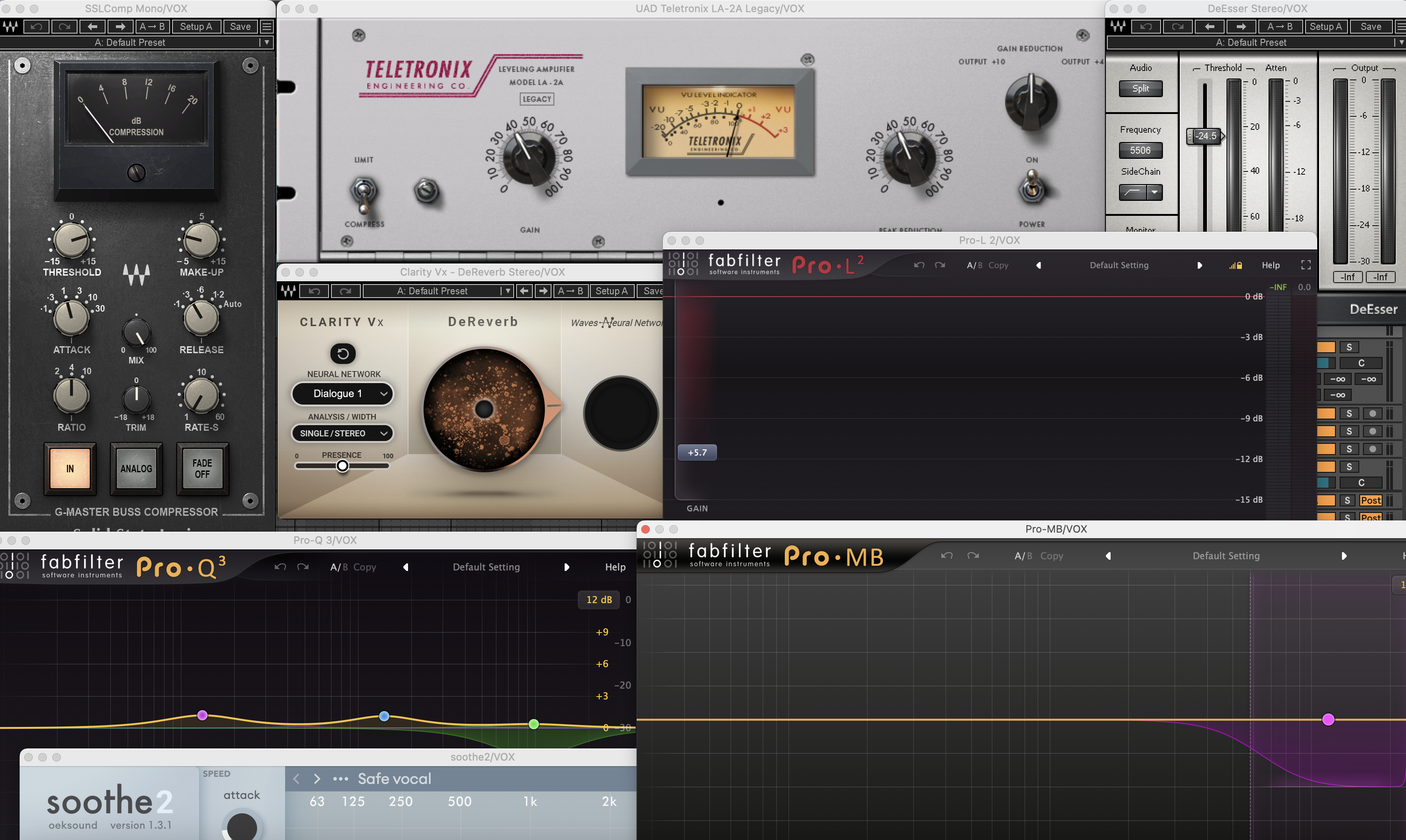 Another reflection would be, it’s a fun challenge working with introspective musicians come vocalists! Steff occasionally graces the tracks with some heartfelt vocals which are meant to act as both a lyric and another instrument layer. Steff was definite that the vocals had to not stand up front like a Pop vocal, but rather, sit right back in the mix and be as hazy and washed out as possible. In this balancing act, I had to incorporate quite a few extended mixing techniques. Firstly, to keep Steff’s vocal audible while using so much reverb and delay, I used side-chain compression on the FXs so that the vocal ducked the FXs volume just a bit to keep Steff’s vocal from being swallowed by the said FXs. Further, to keep the vocal from getting lost in the wall of guitars, I resorted to using Waves F6 on the Guitar Sum Bus, and routing the vocal as the key input/ side-chain compression signal for the guitars, so that the guitars ducked slightly when Steff is singing. I particularly like the F6 plugin as it’s easy to set the compression to occur only in the mids/ and or sides, and at whatever frequency band the vocal is most dominant. As Steff was panned centre, I applied only frequency specific compression in the mids, and at around 2-3kHz.