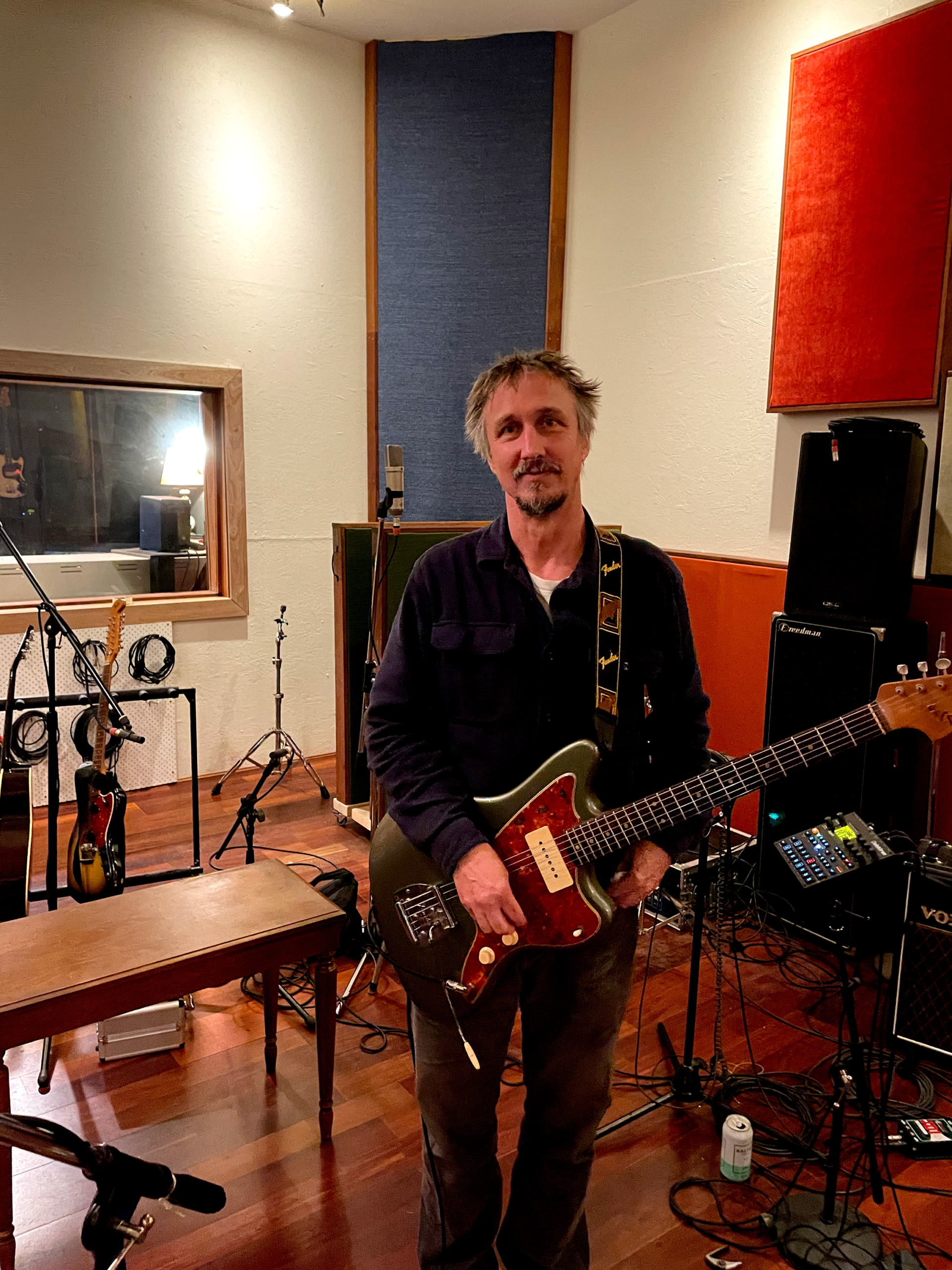Close mics – Shure SM57, Neumann KM84, Royer R-121 ( 1 foot back – to one protect the ribbon, amps were LOUD, and to reduce proximity effect)