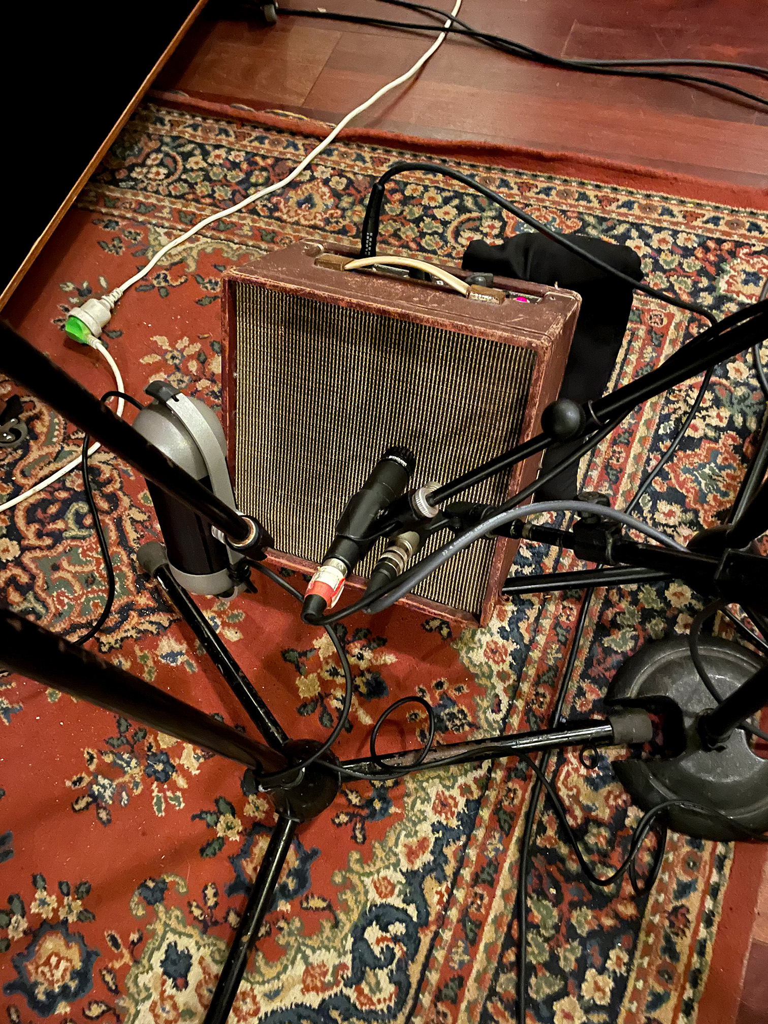 Close mics – Shure SM57, Neumann KM84, AEA N-92 ( 1 foot back – to one protect the ribbon, amps were LOUD, and to reduce proximity effect)
